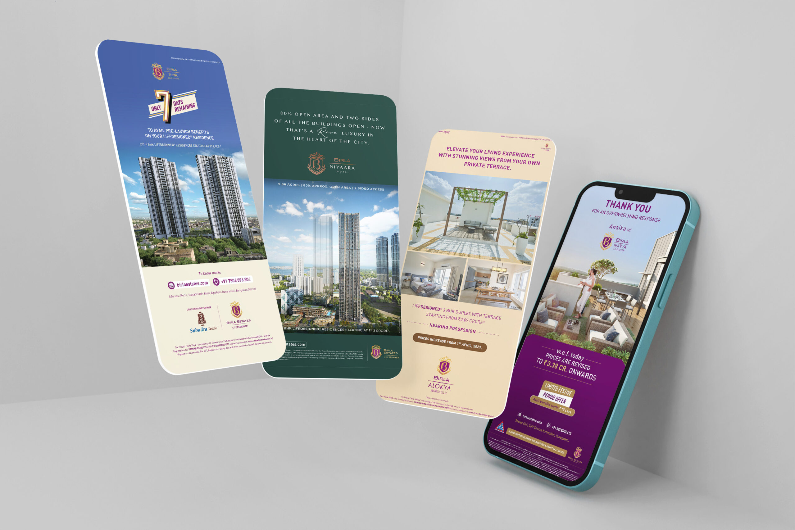 Our collaboration with Birla Estates, a name synonymous with trust and quality, involved crafting compelling narratives for their prestigious projects like Birla Navya, Vanya, Alokya, Niyaara, and Tisya. Over the course of our partnership, we worked on a wide range of creative executions—from elegant brochures and booklets to engaging newsletters and mailers, ensuring the brand’s message remained consistent and impactful.
